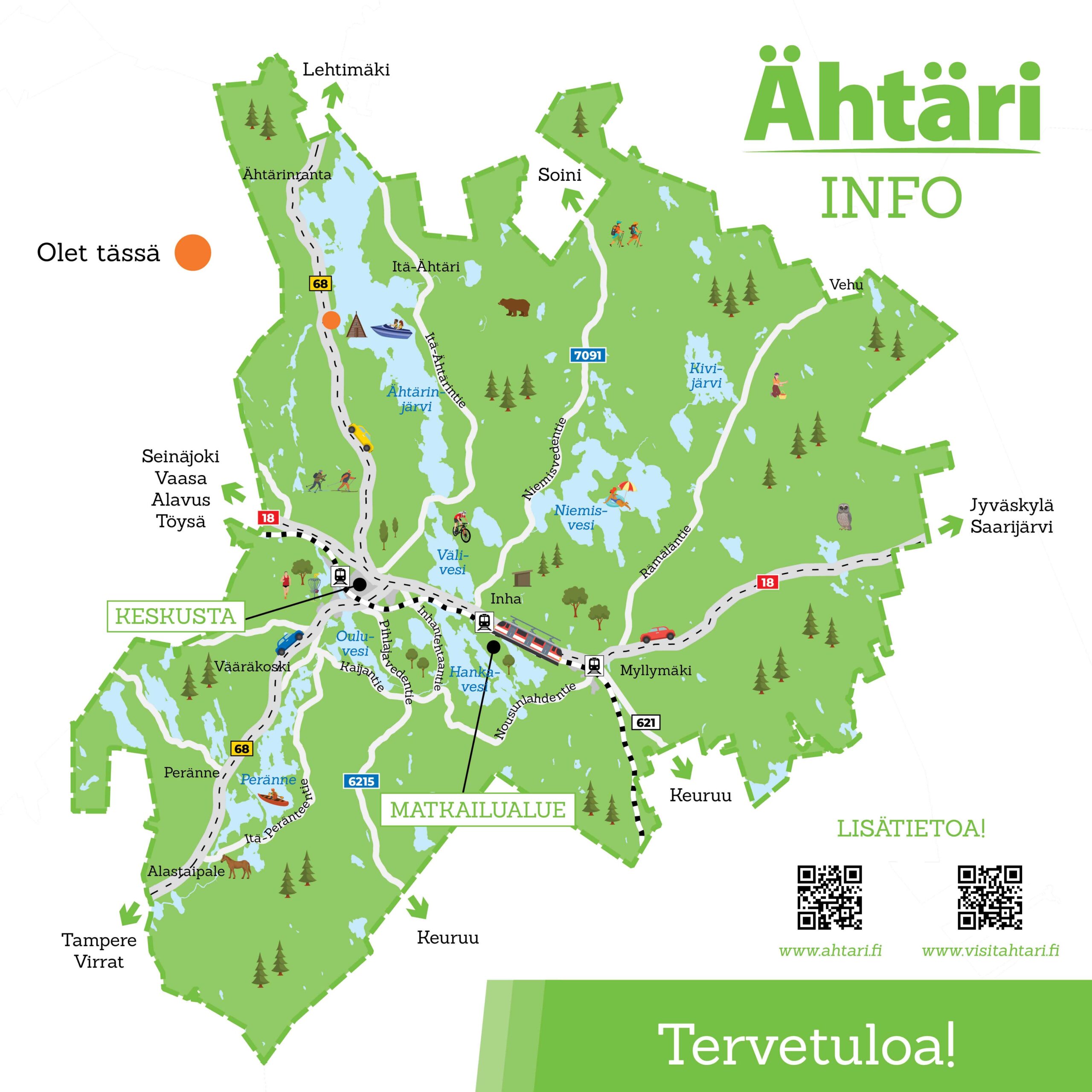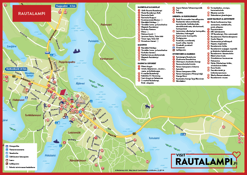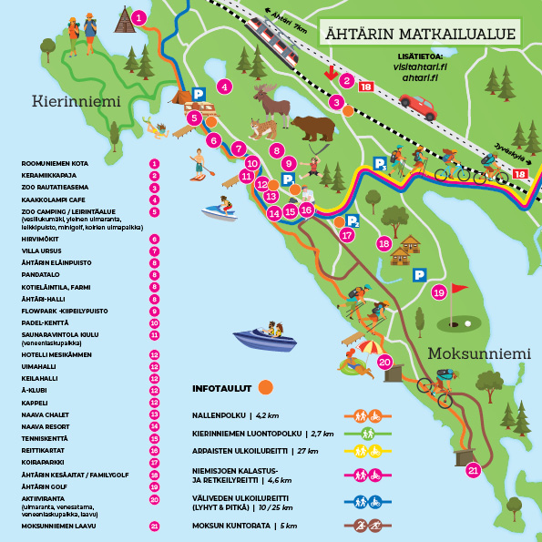 Palvelukartasta matkailija saa parhaat vinkit koko alueen palveluista ja reiteistä. Kartalla mainostavien yritysten sijainti on merkitty selkeästi. Kartta usein säästetään, jolloin myös siinä olevat mainokset tavoittavat matkailijan pitkään. Yhdellä mainoksella yritys saa arvokasta näkyvyyttä koko vuoden ajan!